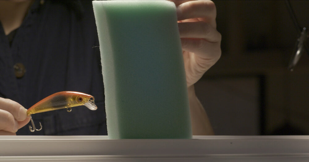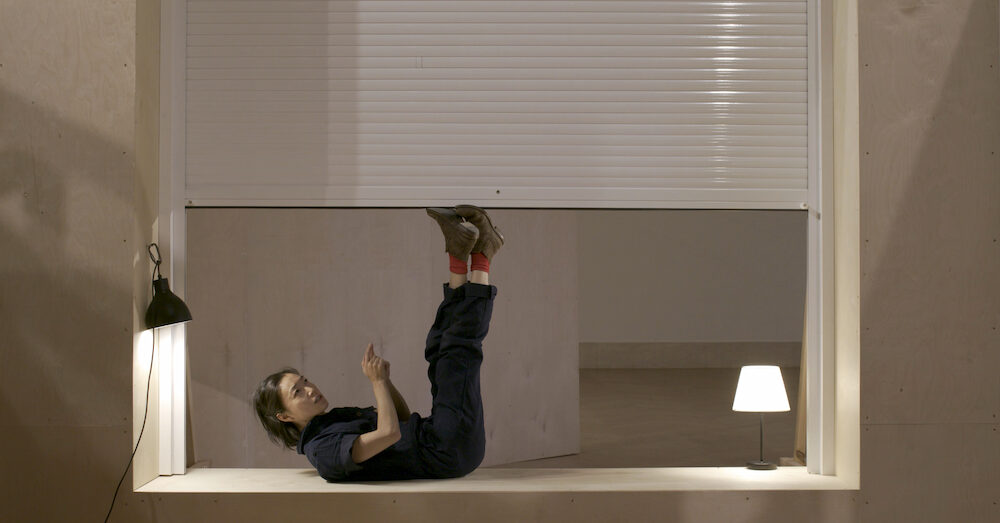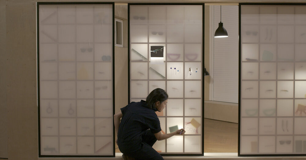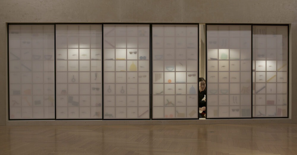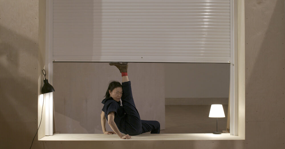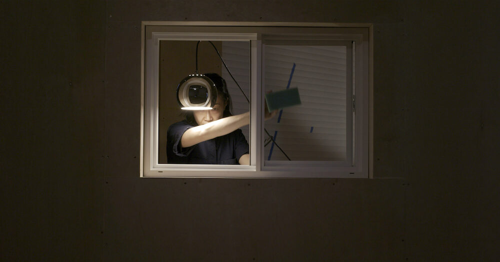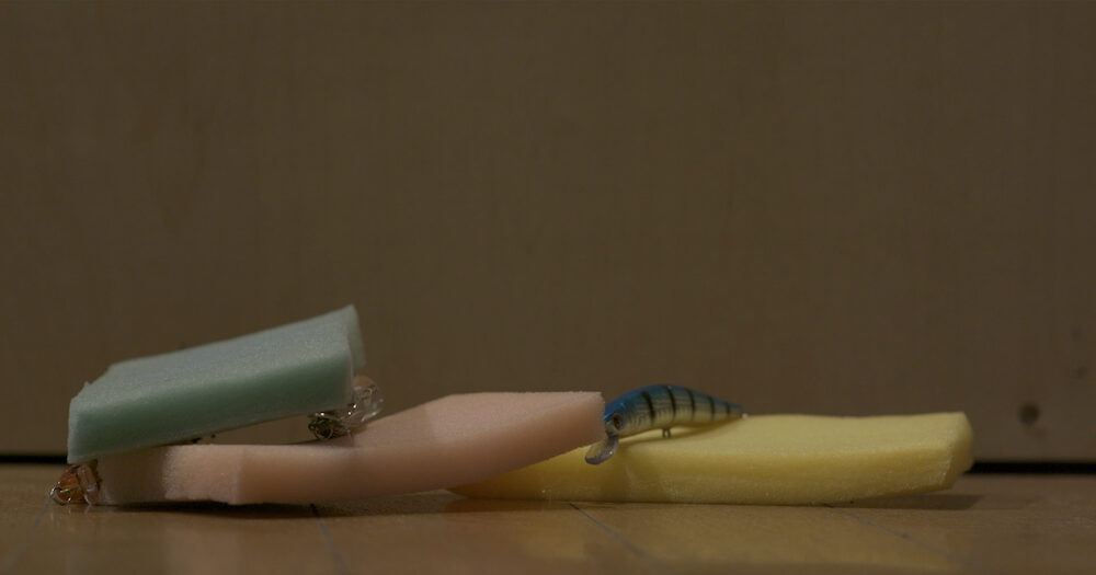 Aki Sasamoto’s modular installation Squirrel Ways (2022) resembles a living room with hybrid partition structures. Shoji screens slide to reveal a door, shutters close, and entire walls become mobile. When these architectural elements are activated, they further reveal their surprising properties including fishing lures and sponges hidden between the double shoji screens, and countless peepholes on the door. In Squirrel Ways, Sasamoto questions the “thickness of borders” that lies between self and other, surface and bottom, life and death, constantly imagining what lies on the other side.