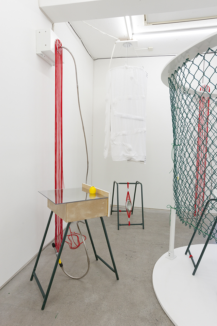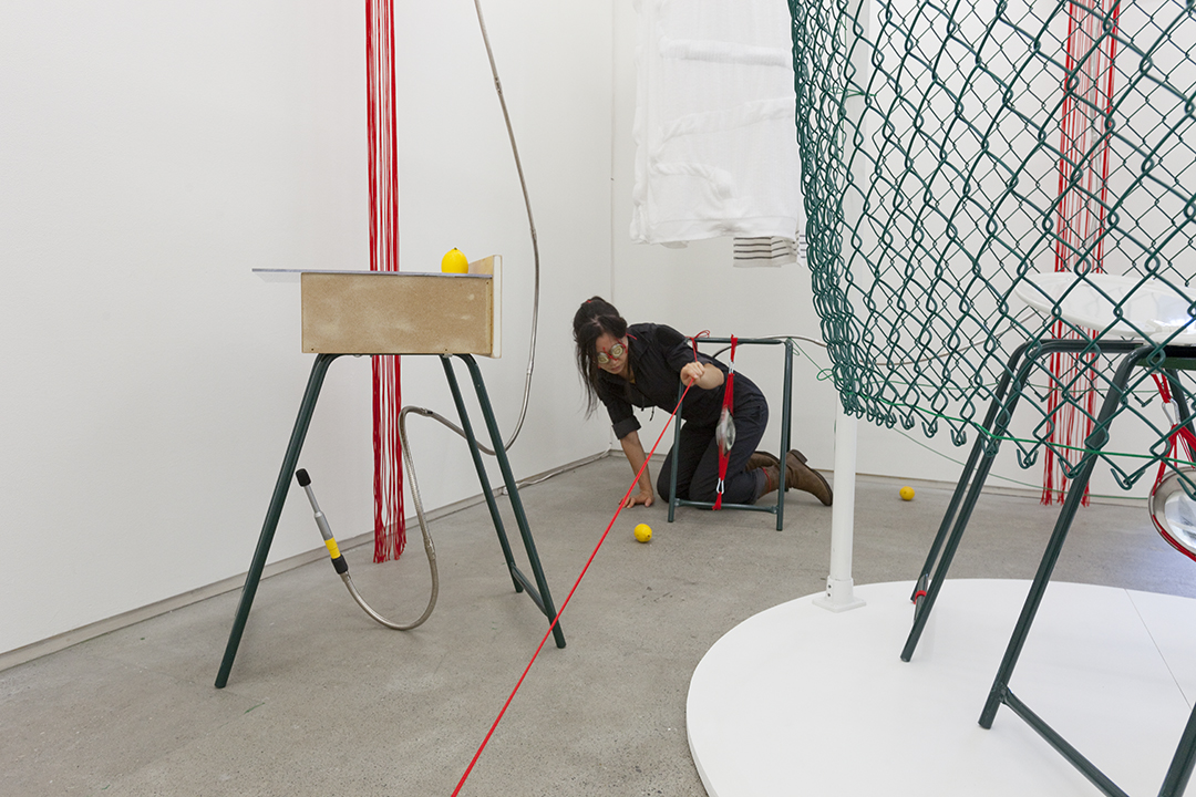 E_O represents ego without gravity. Using childhood nightmares and boxing routines as starting points, this performance/installation explores the gaps between belief and perception, and attempts to establish the inherent geometry of eyesight, the enneagram, muscles and death. The sculptural elements of E_O are inspired in part by vernacular worship culture and ritual, with altar-like structures made of found pipe stands, towel ‘gates’ housing lenses and lemons, pre-recorded sound, plastic bags and paper among the work’s key elements.