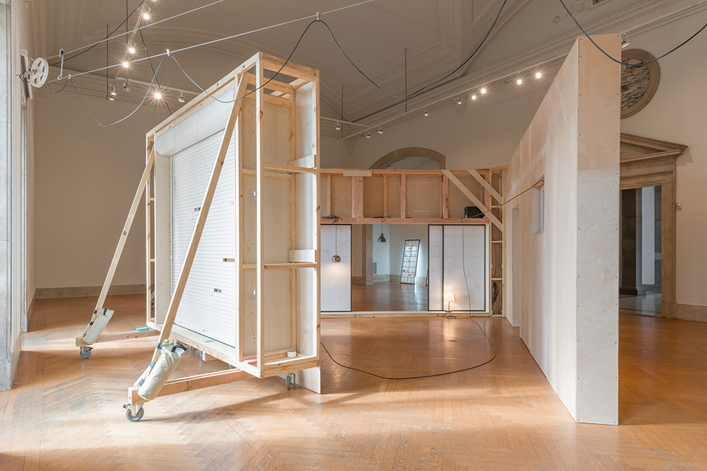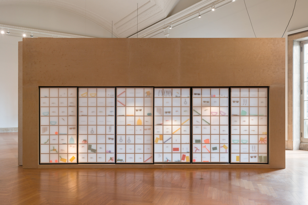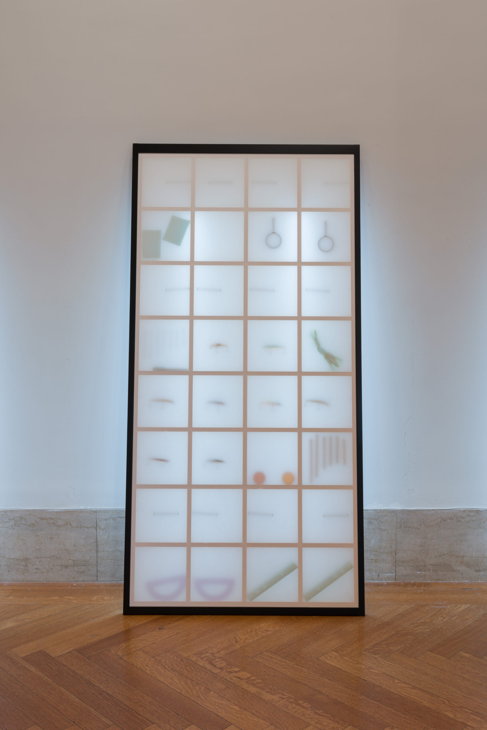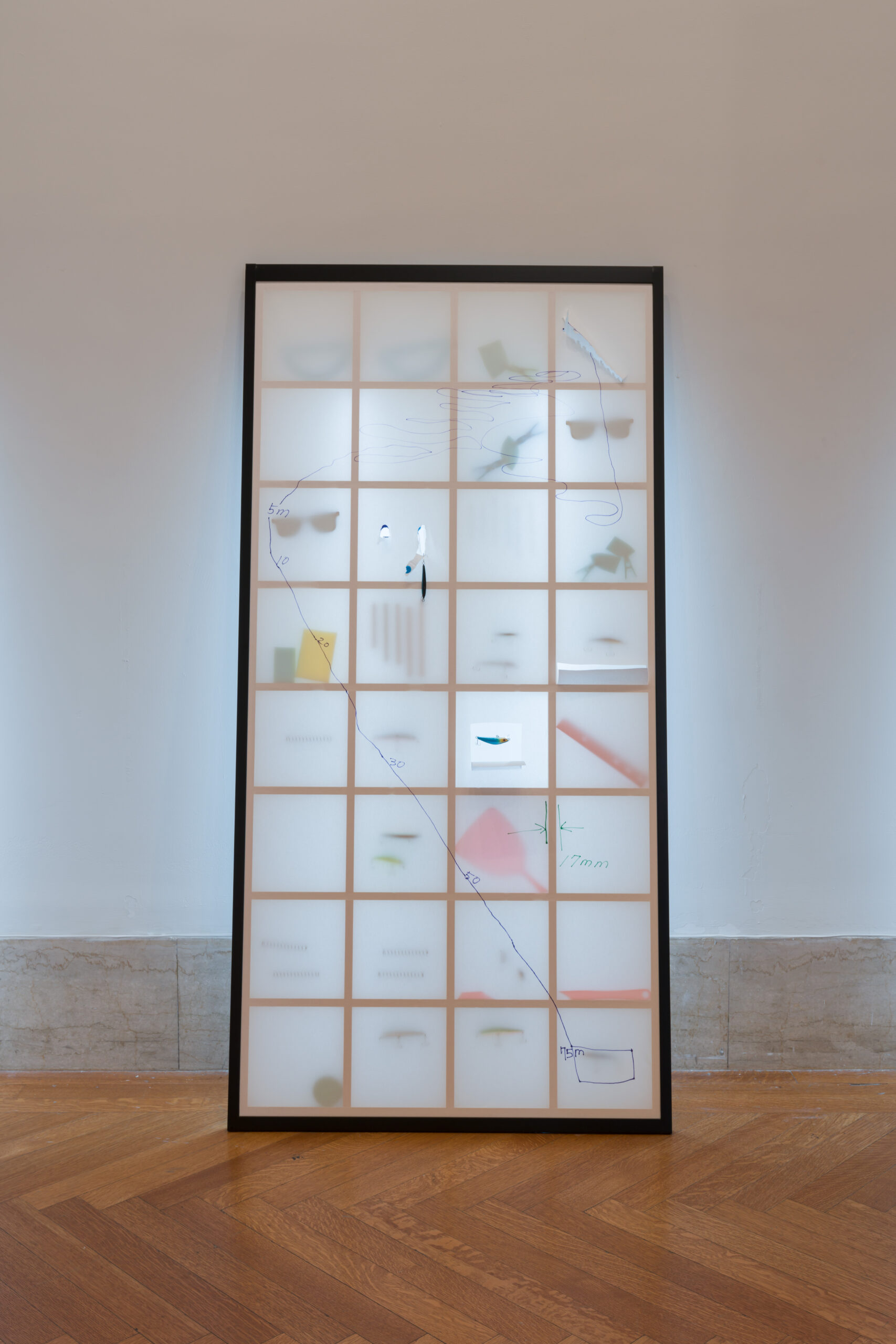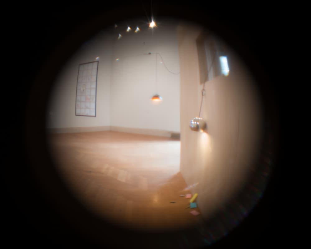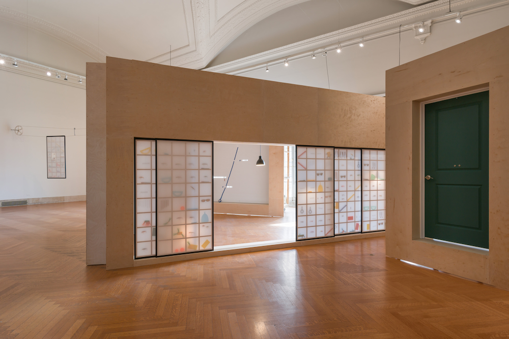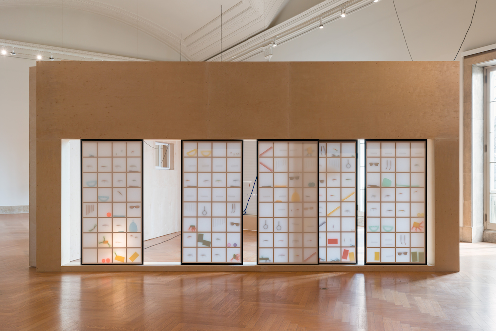 Aki Sasamoto’s modular installation Squirrel Ways (2022) resembles a living room with hybrid partition structures. Shoji screens slide to reveal a door, shutters close, and entire walls become mobile. When these architectural elements are activated, they further reveal their surprising properties including fishing lures and sponges hidden between the double shoji screens, and countless peepholes on the door. In Squirrel Ways, Sasamoto questions the “thickness of borders” that lies between self and other, surface and bottom, life and death, constantly imagining what lies on the other side.