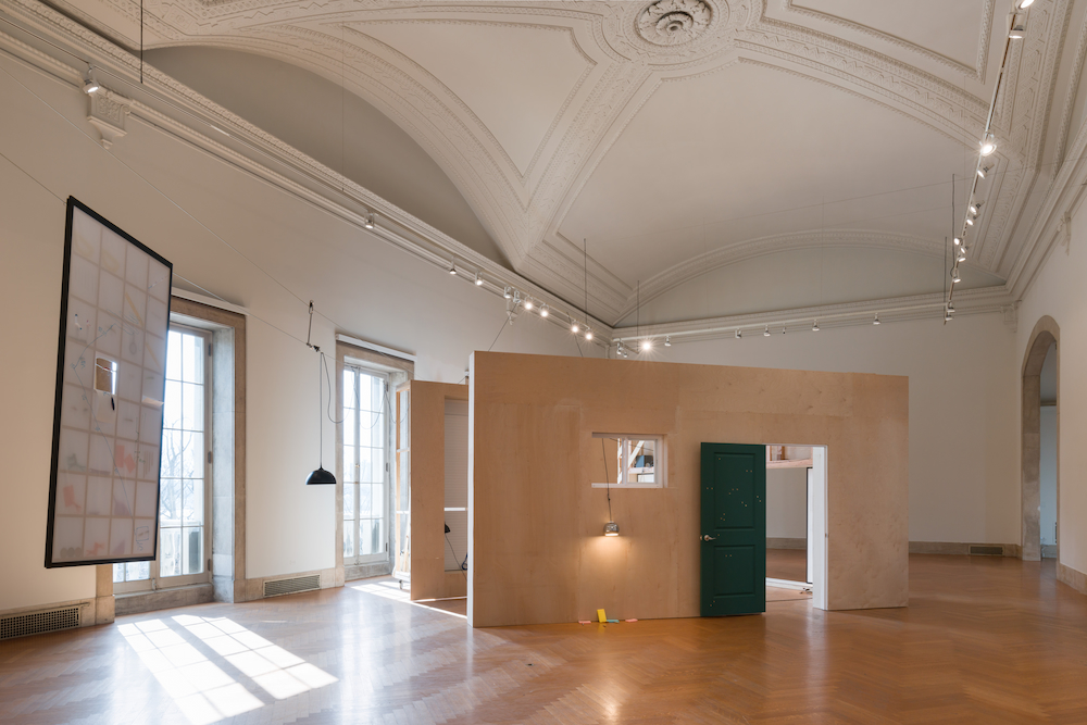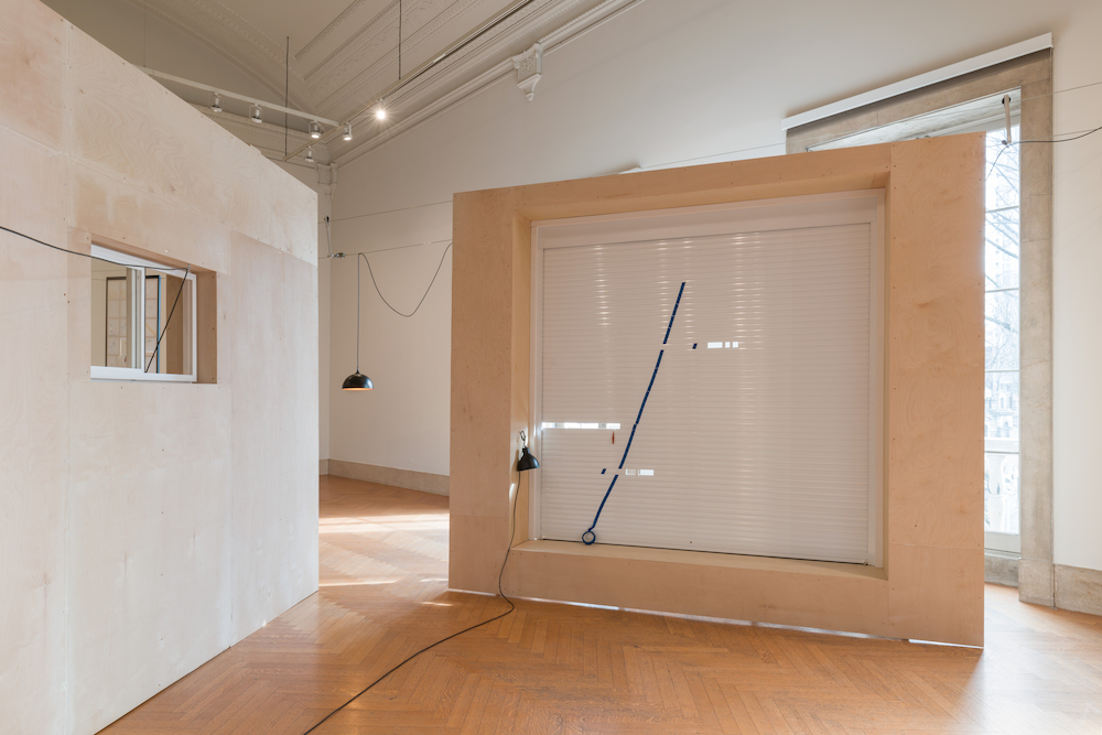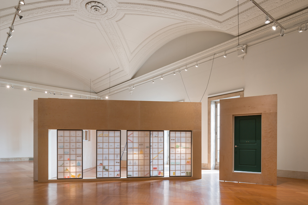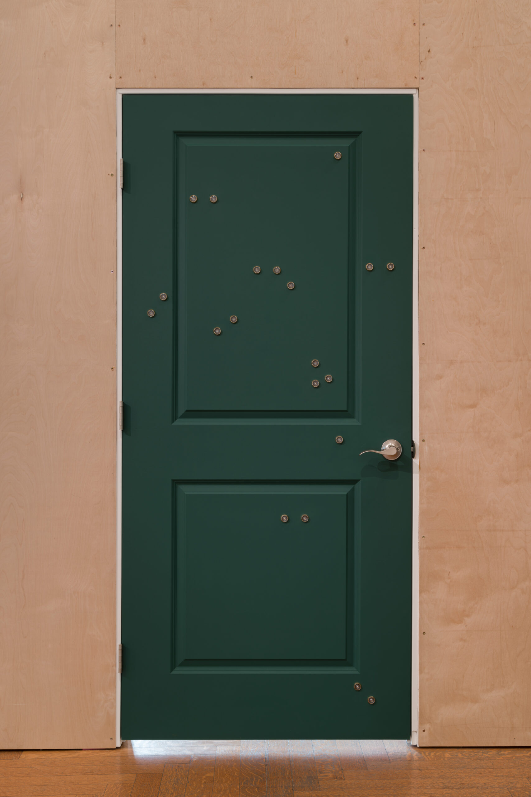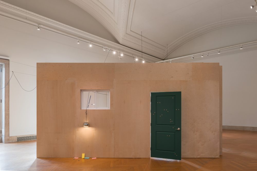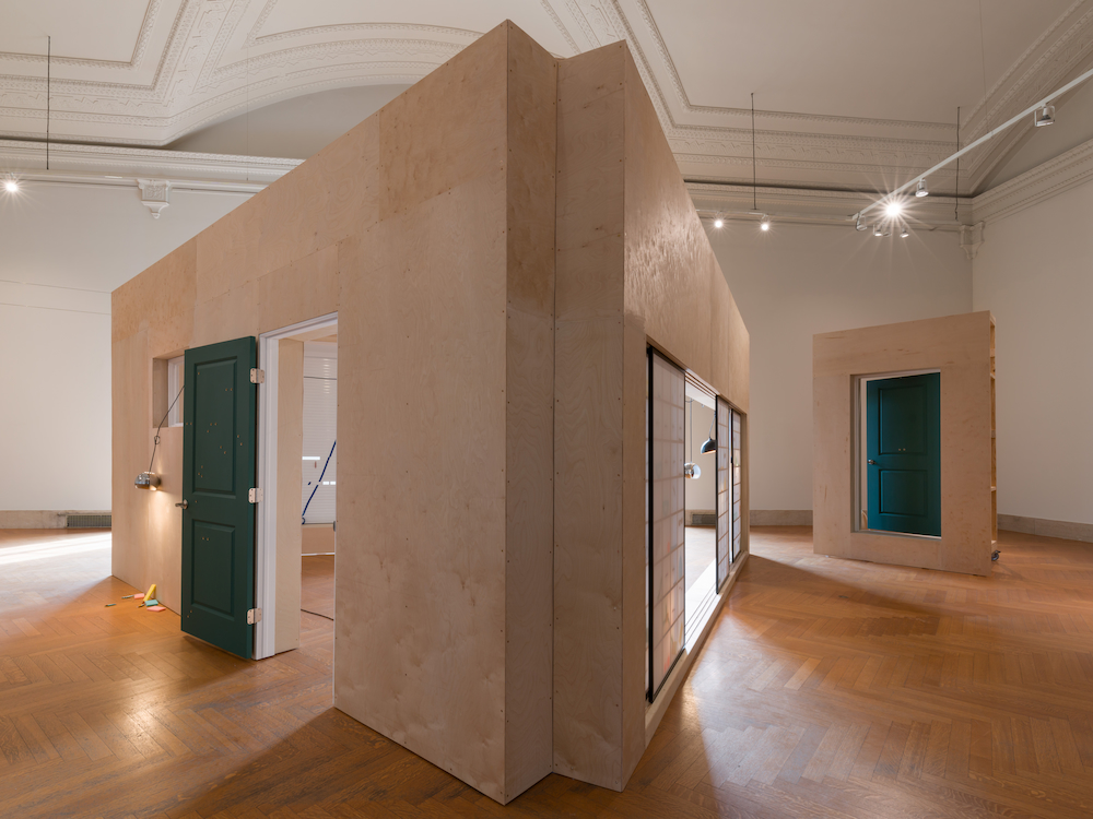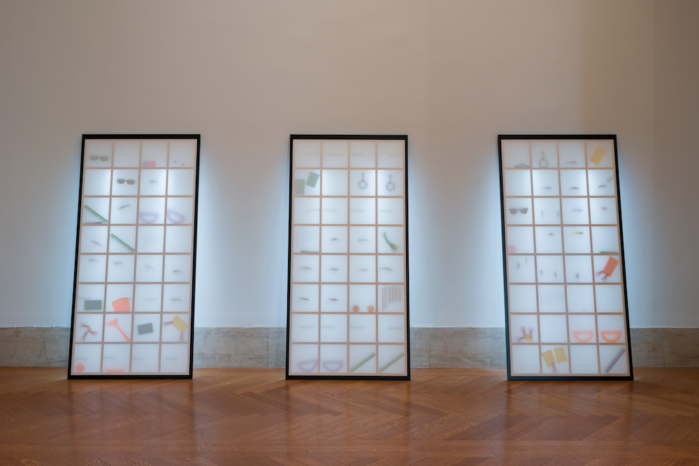 Aki Sasamoto’s modular installation Squirrel Ways (2022) resembles a living room with hybrid partition structures. Shoji screens slide to reveal a door, shutters close, and entire walls become mobile. When these architectural elements are activated, they further reveal their surprising properties including fishing lures and sponges hidden between the double shoji screens, and countless peepholes on the door. In Squirrel Ways, Sasamoto questions the “thickness of borders” that lies between self and other, surface and bottom, life and death, constantly imagining what lies on the other side.