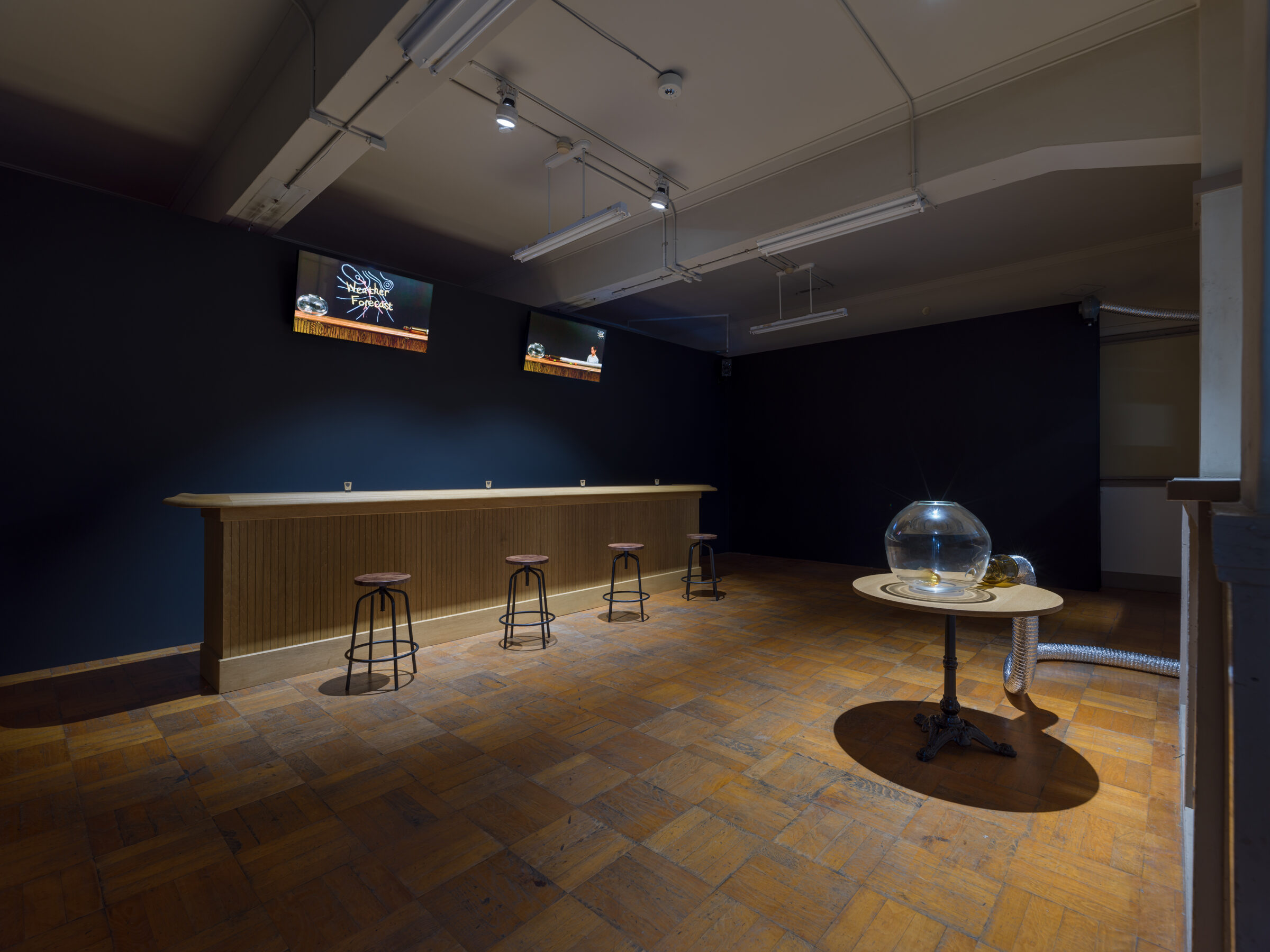 Sasamoto’s multimedia installation Weather Bar (2021) fuses the familiar interior of a common bar and a pseudo–science experiment. The bar is to serve a lonesome customer or a small group. At this unconventional bar, serving a “drink” indicates the act of spinning a whiskey glass. Some other possible drinks are presented in the weather forecast videos, in its making as demonstration. As the forecasts unfold, science and mystery are fused with much satire for the recent abnormal world events and climate changes.