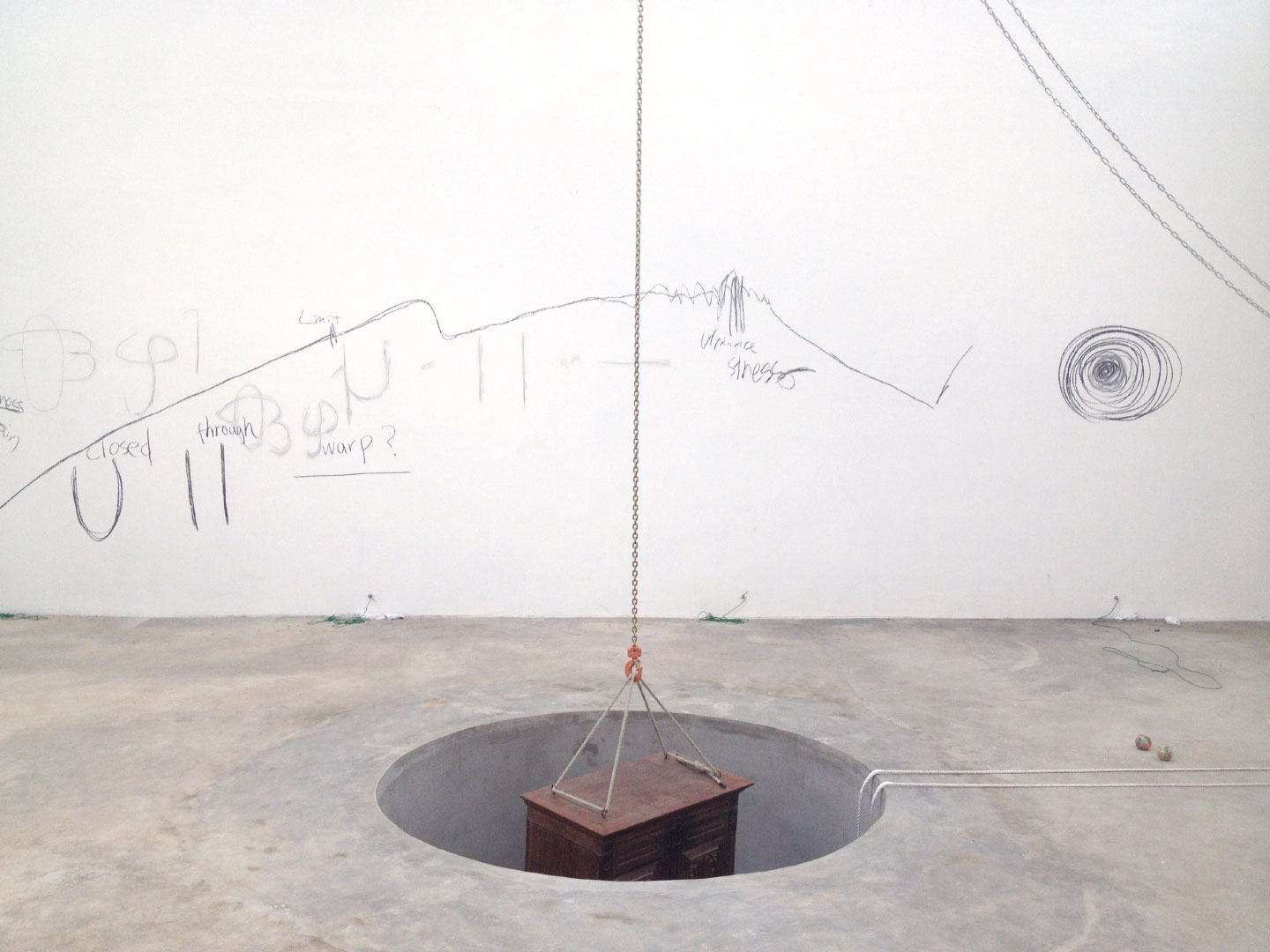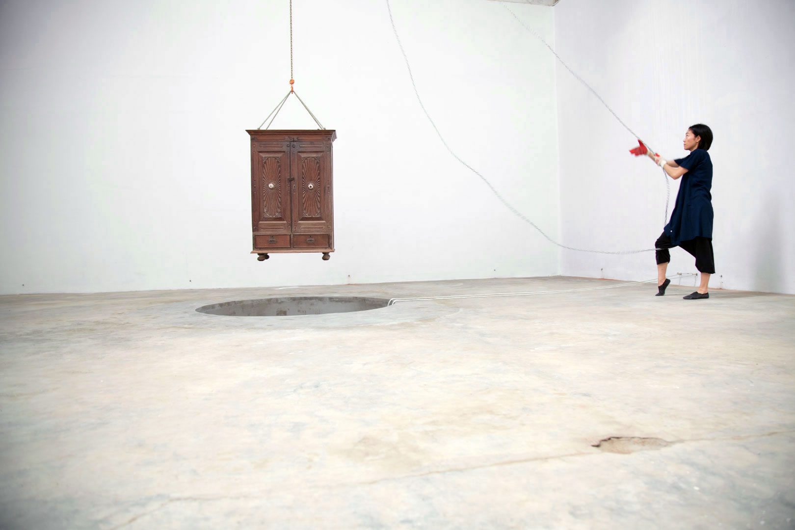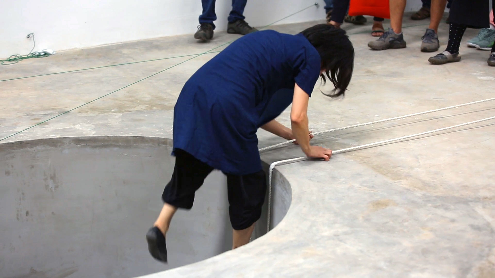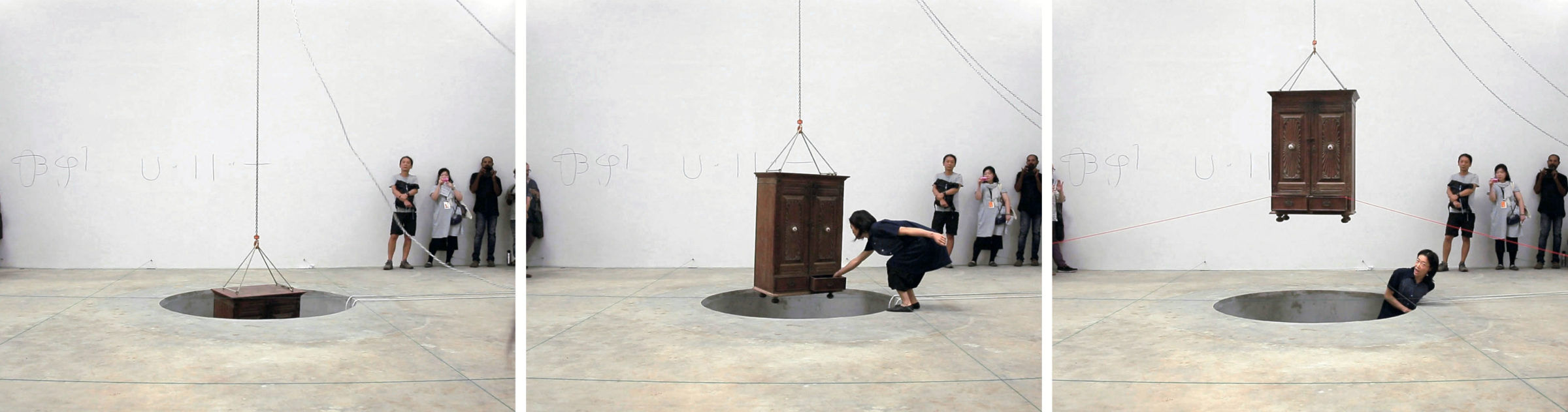 A 7 foot deep hole in the ground with a trampoline at the bottom. The rigged cabinet is drawn out of the hole, and Sasamoto jumps up and down in the hole, with her eyes testing the feeling of traversing above and below the sea level. During the performance, she draws and moves in patterns as speaking the stream of consciousness about elasticity and a hole.