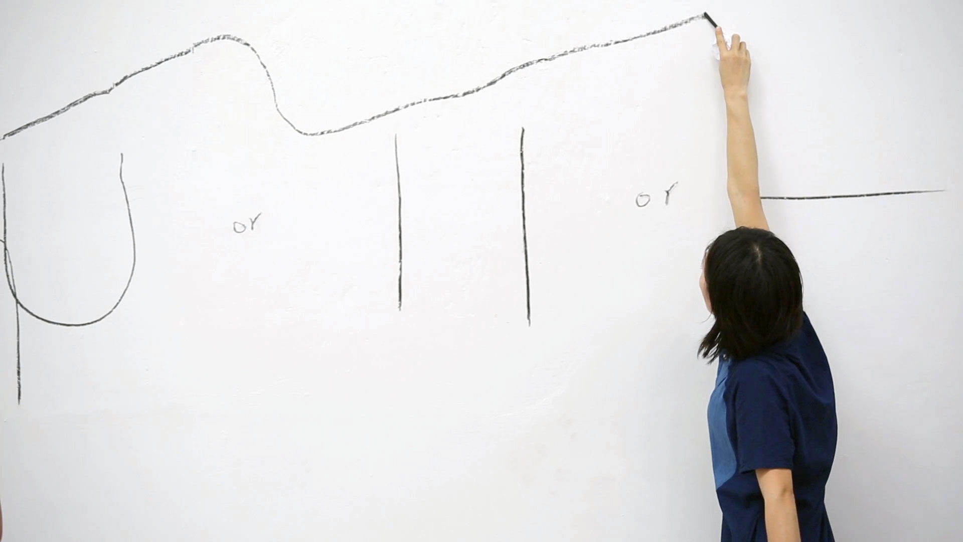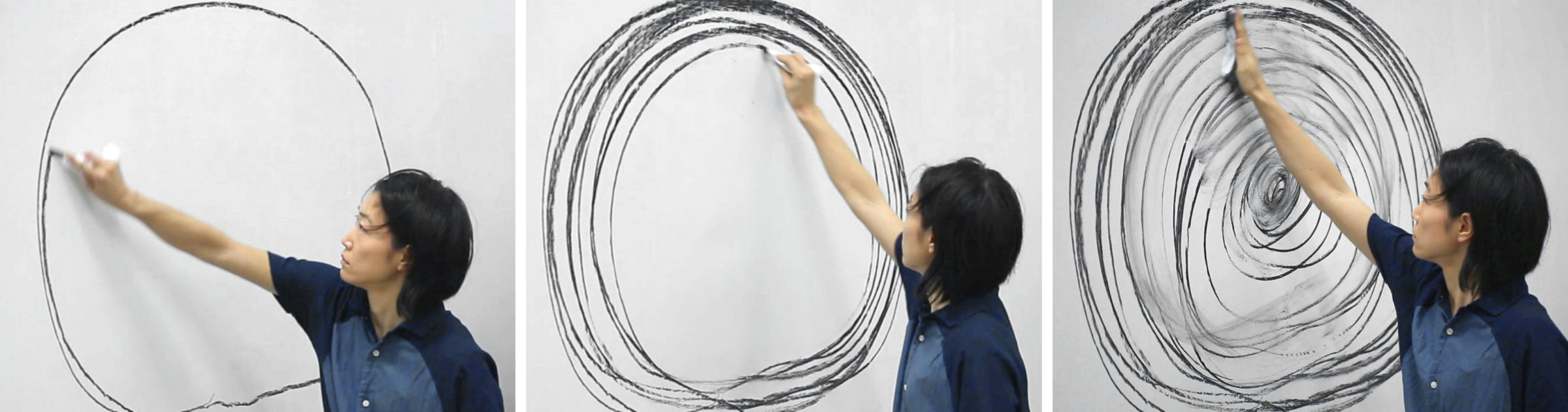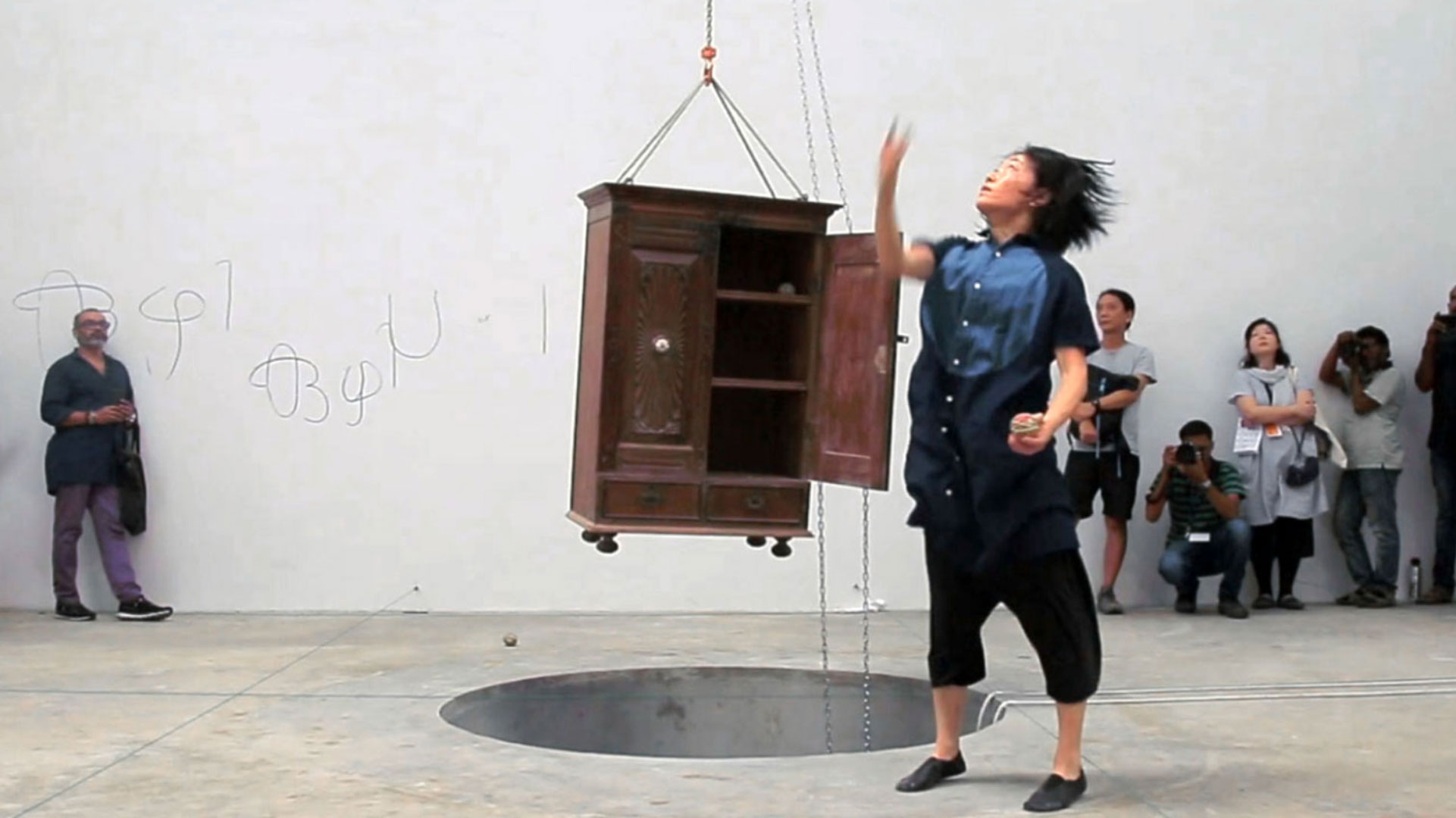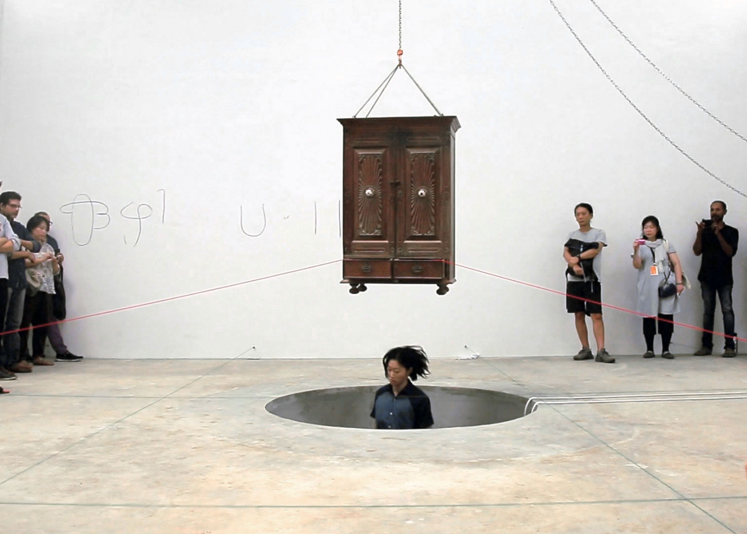 A 7 foot deep hole in the ground with a trampoline at the bottom. The rigged cabinet is drawn out of the hole, and Sasamoto jumps up and down in the hole, with her eyes testing the feeling of traversing above and below the sea level. During the performance, she draws and moves in patterns as speaking the stream of consciousness about elasticity and a hole.